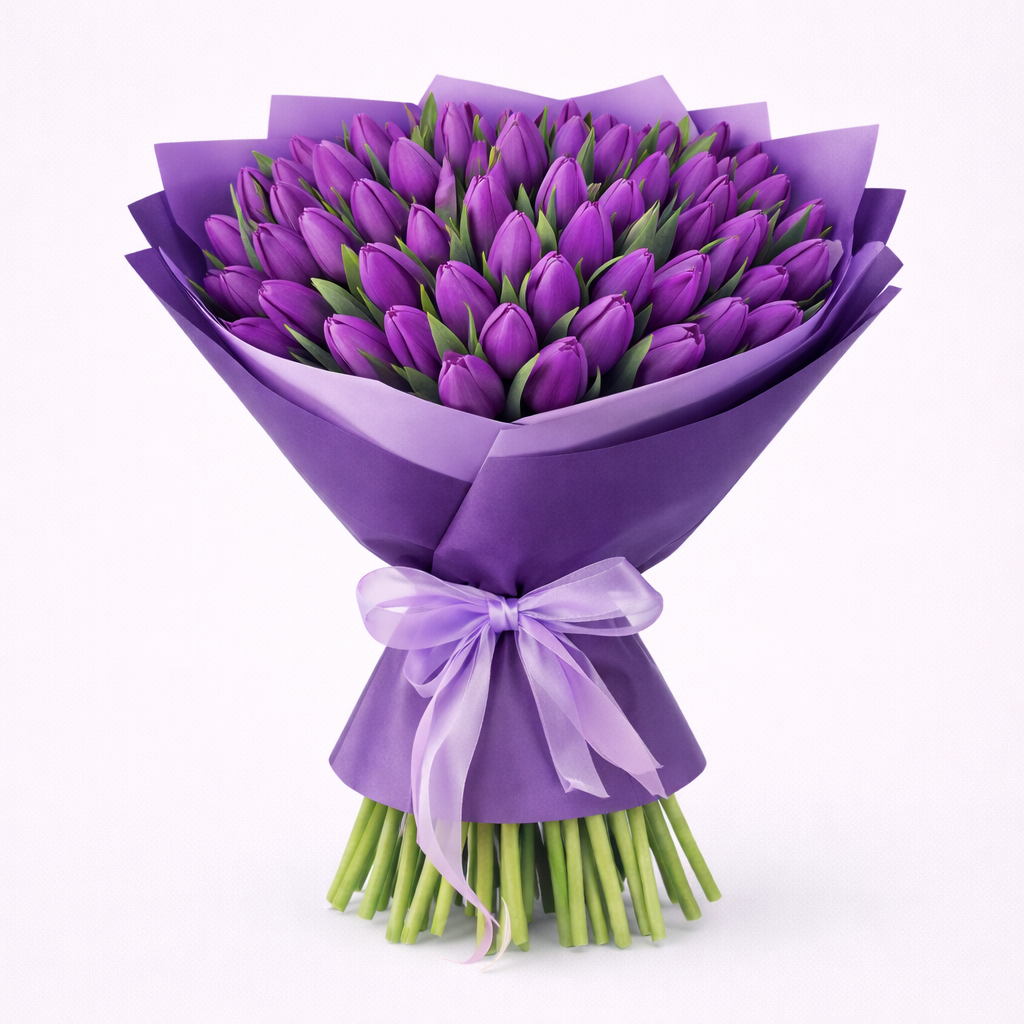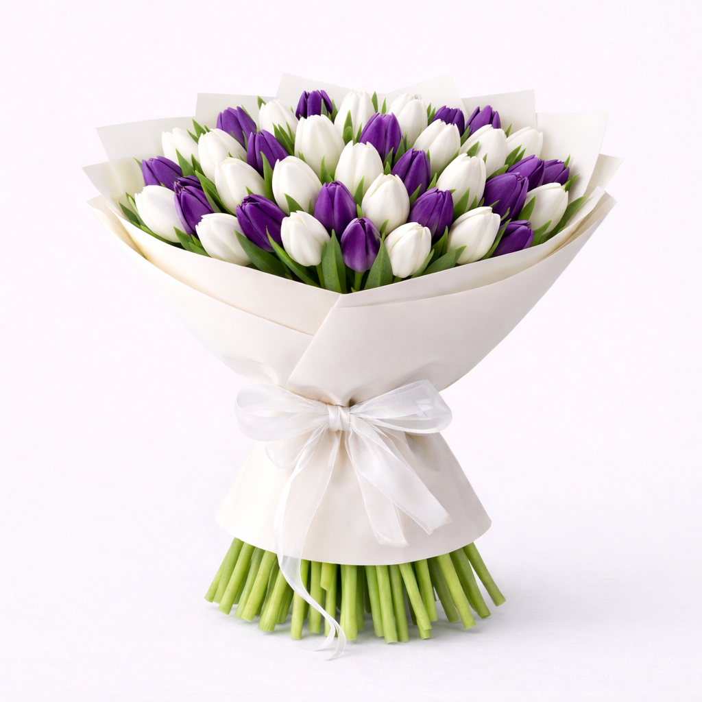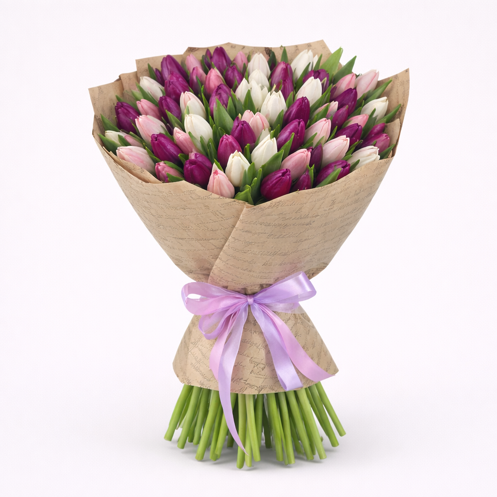 5.000,00 MDL4.545,00 MDLSpring bouquet of 101 tulips in a package. The transition from white tulips to purple through the connecting purple is a wonderful combination that pleases the eye. Tulips will delight the recipient with a light aroma and longevity.