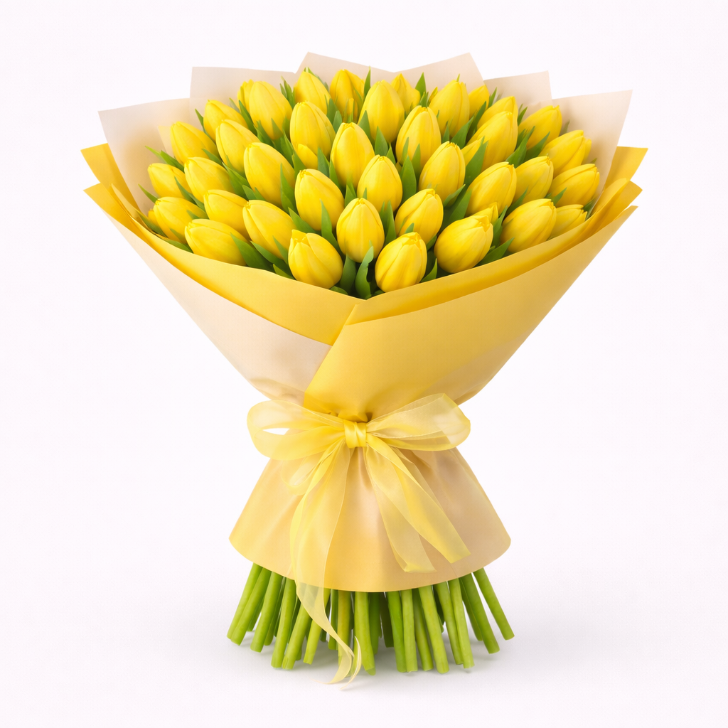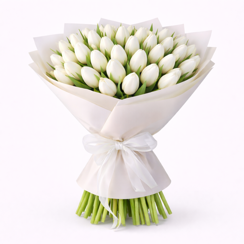 5.000,00 MDL4.545,00 MDLSpring bouquet of 101 tulips in a package. White tulips, with a beautiful opening, their center with bright, yellow stamens will remind you of the light of a romantic moon.