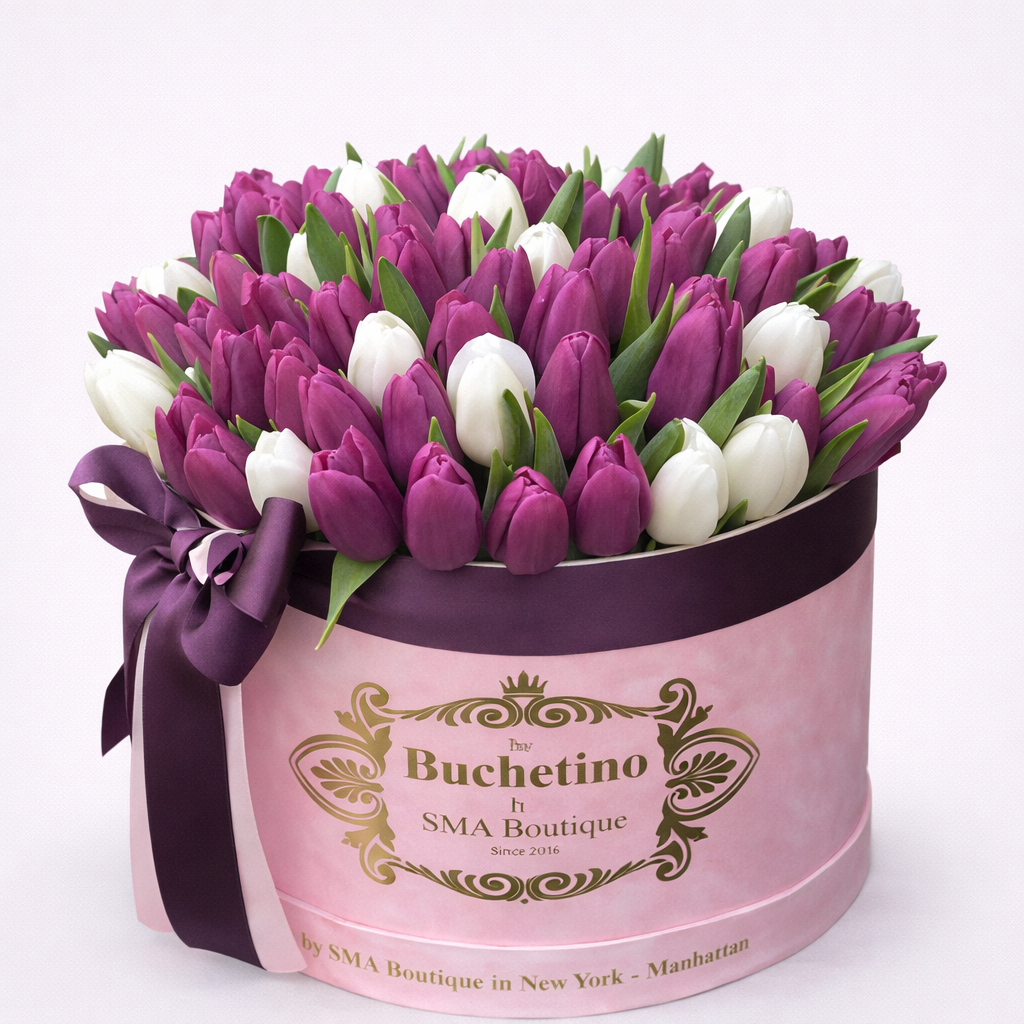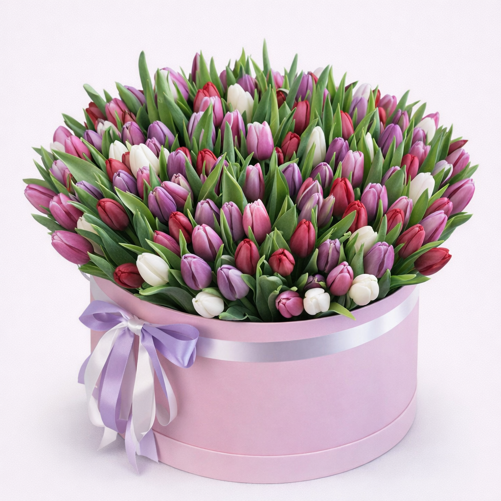 Aranjament floral premium în cutie rotundă elegantă, compus din 101 lalele proaspete în nuanțe vibrante de roșu și alb. O combinație spectaculoasă ce exprimă pasiune, eleganță și rafinament, ideală pentru 8 Martie, 14 Februarie, Valentine’s Day, aniversări sau surprize romantice la domiciliu.