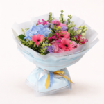 Buchetul Pastel Elegance este o compoziție florală premium realizată din hortensie albastră delicată, gerbera roz intens, lisianthus mov, trandafiri roz și verdeață decorativă atent aleasă. Aranjamentul este ambalat într-un design elegant, modern, cu panglică satinată, perfect pentru un cadou rafinat.